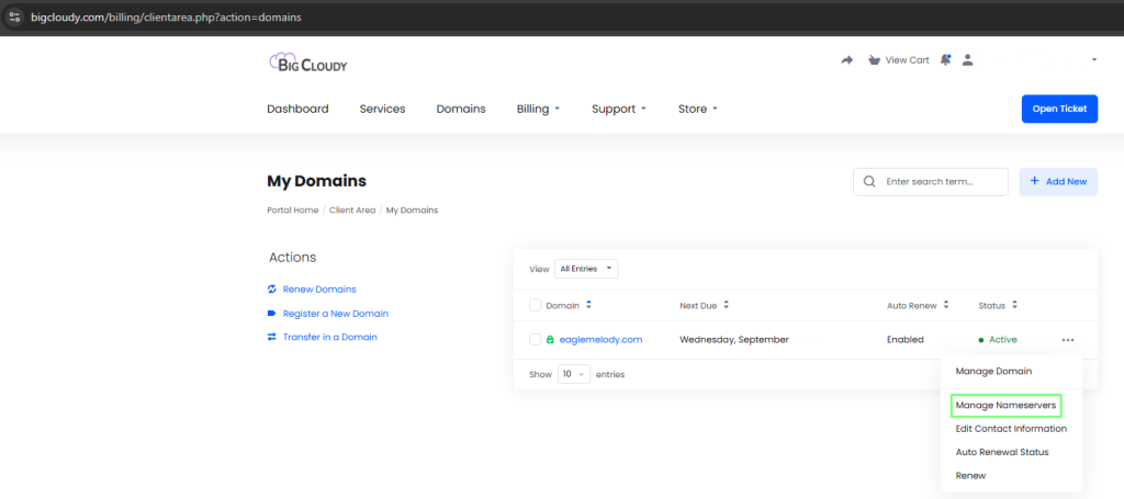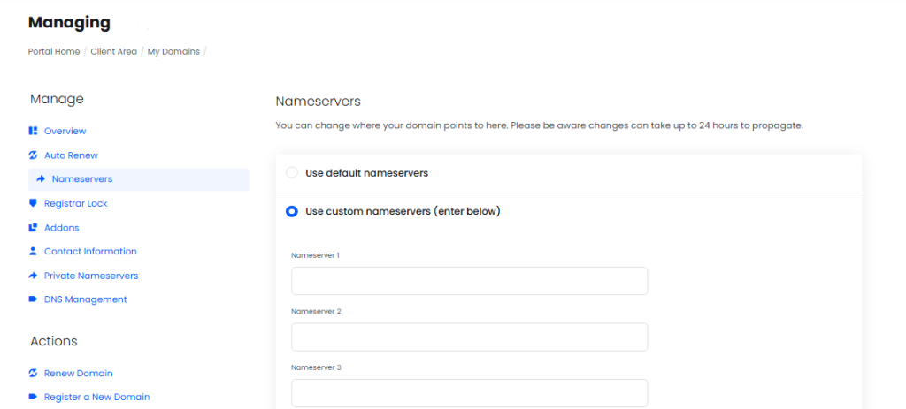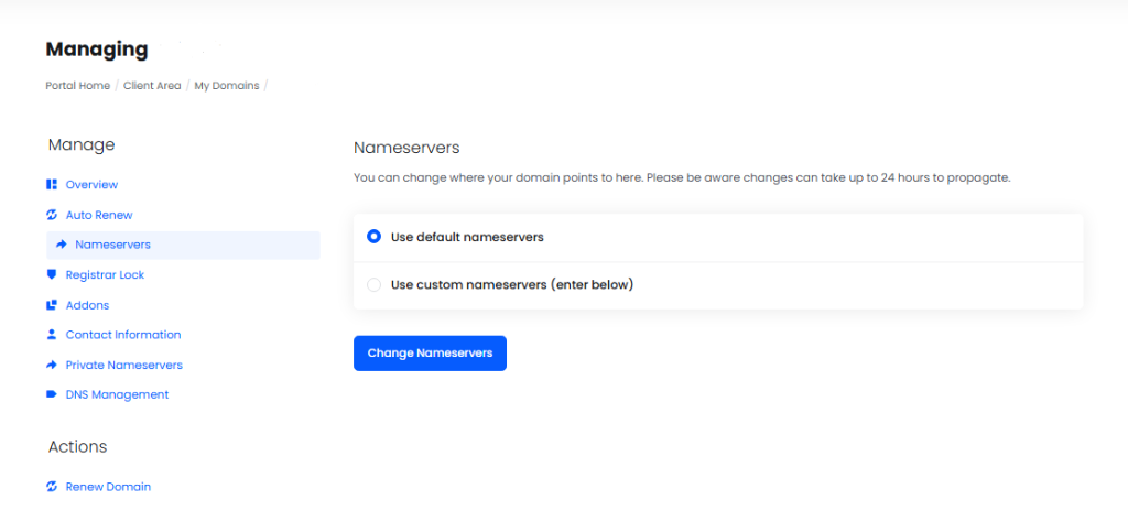 How To Change Nameservers for Your domain From the client area? IntroductionThis article explains how to change your domain’s nameservers directly from your BigCloudy client area. Changing nameservers allows you to point your domain to a new hosting provider or DNS manager.Follow these steps to update them safely and ensure your website stays connected to the correct server. 1. Log in to the Client Area Go to your Client Area login and log in using your registered email and password. Tip: Bookmark your client area URL for quick access next time. 2. Go to “Domains” From the dashboard, click on the Domains tab to view all your registered domains 3. Select Your Domain Find the domain you want to manage and click Manage Domain or Manage DNS 4. Find the Nameservers Section Under the Nameservers section, you’ll see options like:Use default nameservers Select this if you want to use our hosting default nameserver which are:ns1.bigcloudy.comns1.bigcloudy.comUse custom nameservers (enter below)Choose this to specify your own nameservers. Note: DNS propagation may take up to 24–48 hours for global updates to complete. 5. Wait for DNS Propagation Changes may take up to 24 hours to fully propagate globally. During this time, your website may load intermittently between old and new settings.NotesNameserver changes may take 24–48 hours to propagate globally, depending on DNS caching.Ensure you copy and paste the nameservers exactly as provided to avoid outages.If your domain is locked or pending verification, nameserver changes may not apply until the issue is resolved.Some TLDs have specific restrictions on nameserver formats or require a minimum of 2 nameservers.DNS hosted with the previous provider will stop working once nameservers are updated—ensure all required DNS records exist on your new DNS service. Need Help? If you face any issues updating your nameservers or need further assistance, our support team is always available: Email: support@bigcloudy.com Submit a support ticket ConclusionYou’ve successfully updated your domain’s nameservers from the BigCloudy client area. This process allows you to control where your domain points, whether to BigCloudy’s servers or a third-party host.Remember that DNS changes may take time, so be patient while they fully propagate worldwide. FAQ How long does it take for nameserver changes to update globally?Nameserver updates typically take 24–48 hours to fully propagate, though some regions may update sooner. Do I need to unlock my domain before changing nameservers?In most cases, unlocking is only required for domain transfers, not nameserver updates. However, some registrars may require unlocking to modify nameservers. Will my website or email go down after updating nameservers?They may go down if the new DNS provider does not have the correct DNS records. Always verify your DNS records before switching nameservers. Can I change nameservers for a domain that is expired?Most registrars do not allow nameserver changes on expired domains. You must renew the domain first. Why do I see an error when saving new nameservers?Errors usually occur due to invalid nameserver formatting, missing DNS glue records (for custom nameservers), or TLD-specific restrictions. Double-check the nameserver values and try again.
